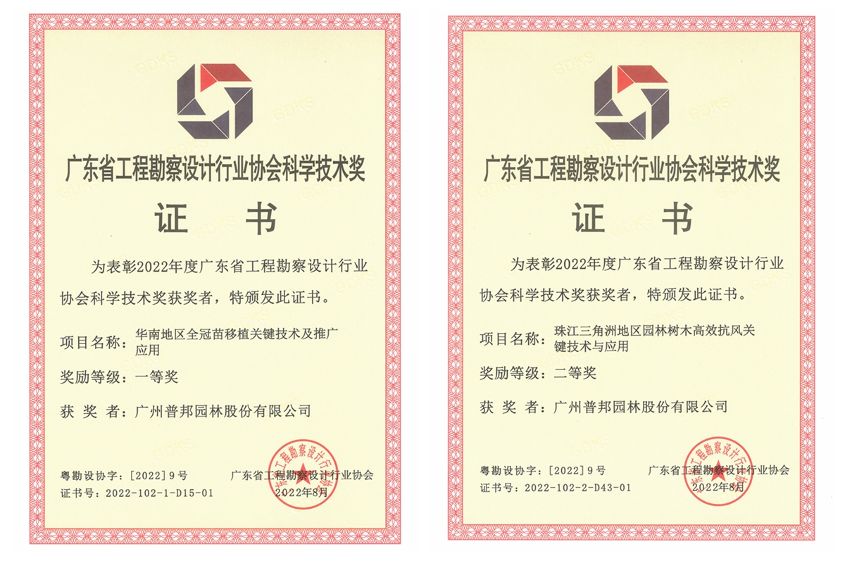 日,2022年廣東省工程勘察設(shè)計行業(yè)協(xié)會科學技術(shù)獎評選結(jié)果公布,我司2項目從119項參評項目中脫穎而出。其中,“華南地區(qū)全冠苗移植關(guān)鍵技術(shù)及推廣應(yīng)用”榮獲科學技術(shù)獎一等獎,“珠江三角洲地區(qū)園林樹木高效抗風關(guān)鍵技術(shù)與應(yīng)用”榮獲科學技術(shù)獎二等獎。